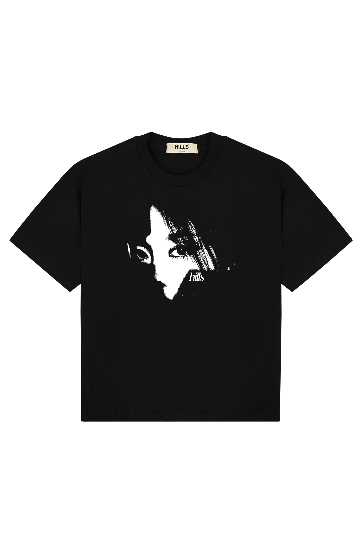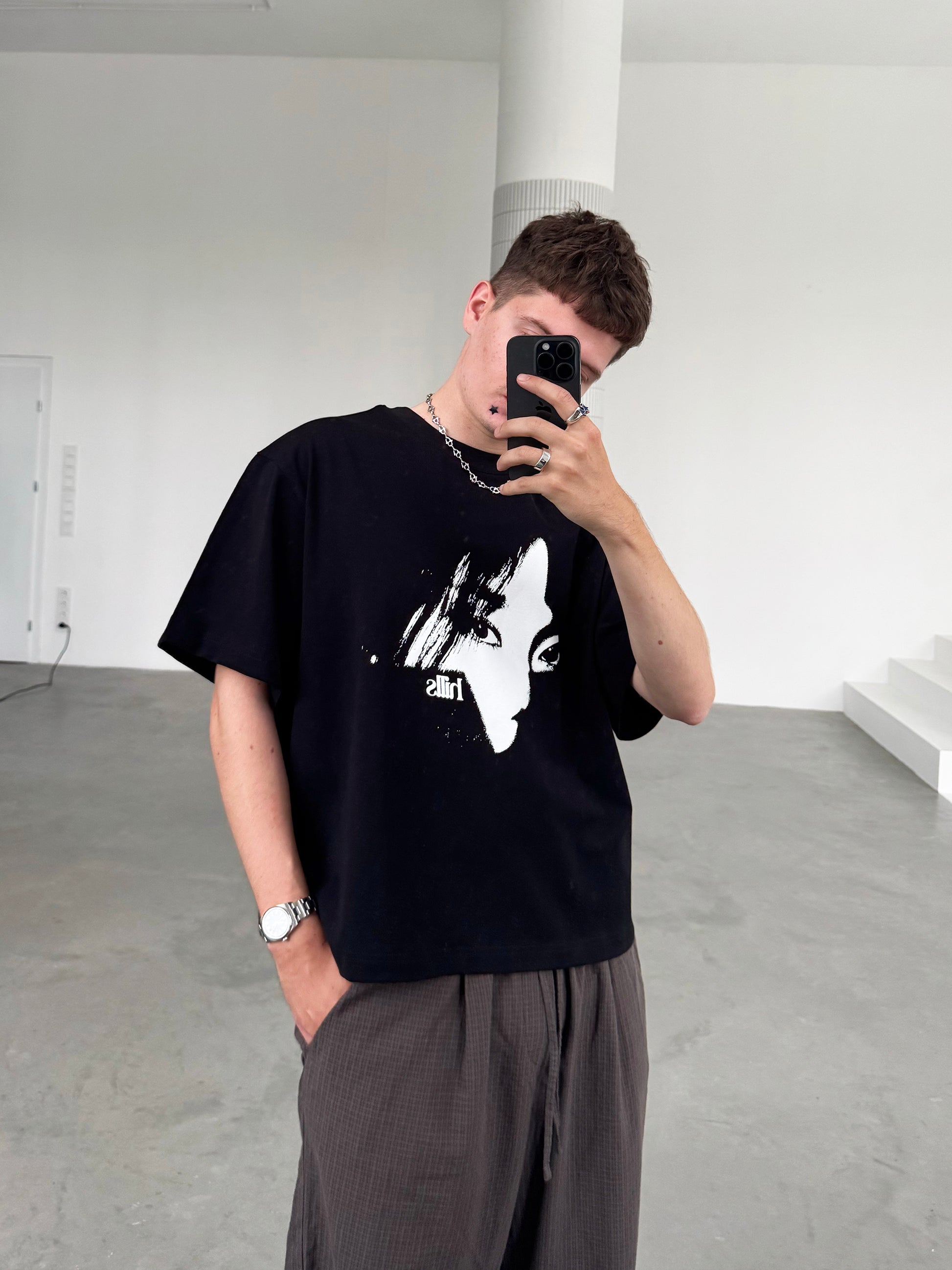 Black, cotton t-shirt with boxy fit and Face print on the front.