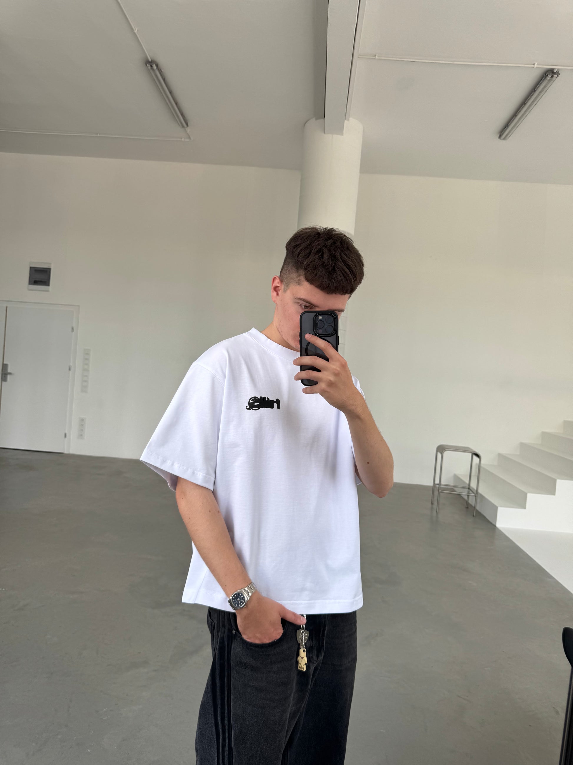 White, cotton boxy tee with printed logo on the front and back.