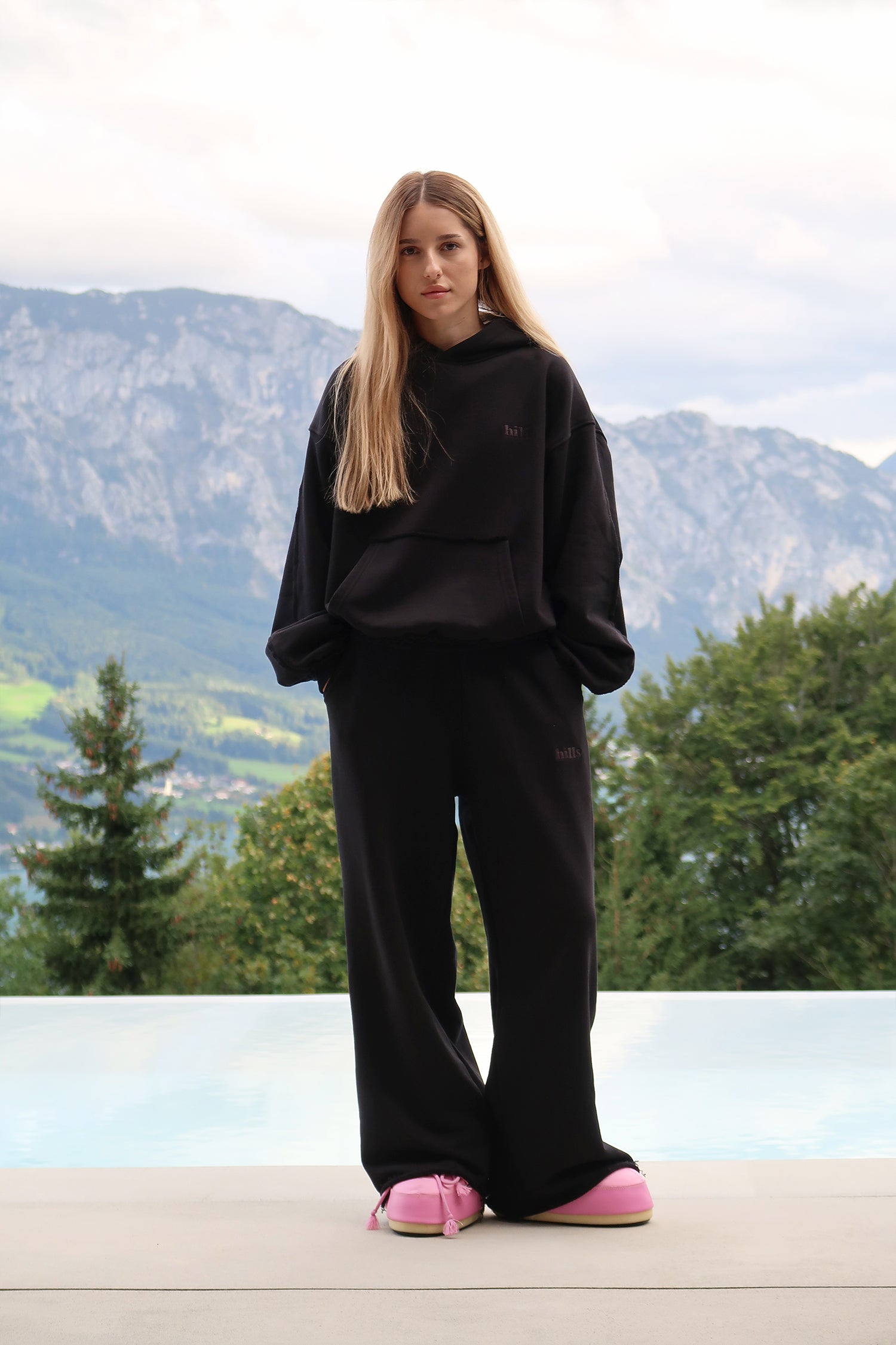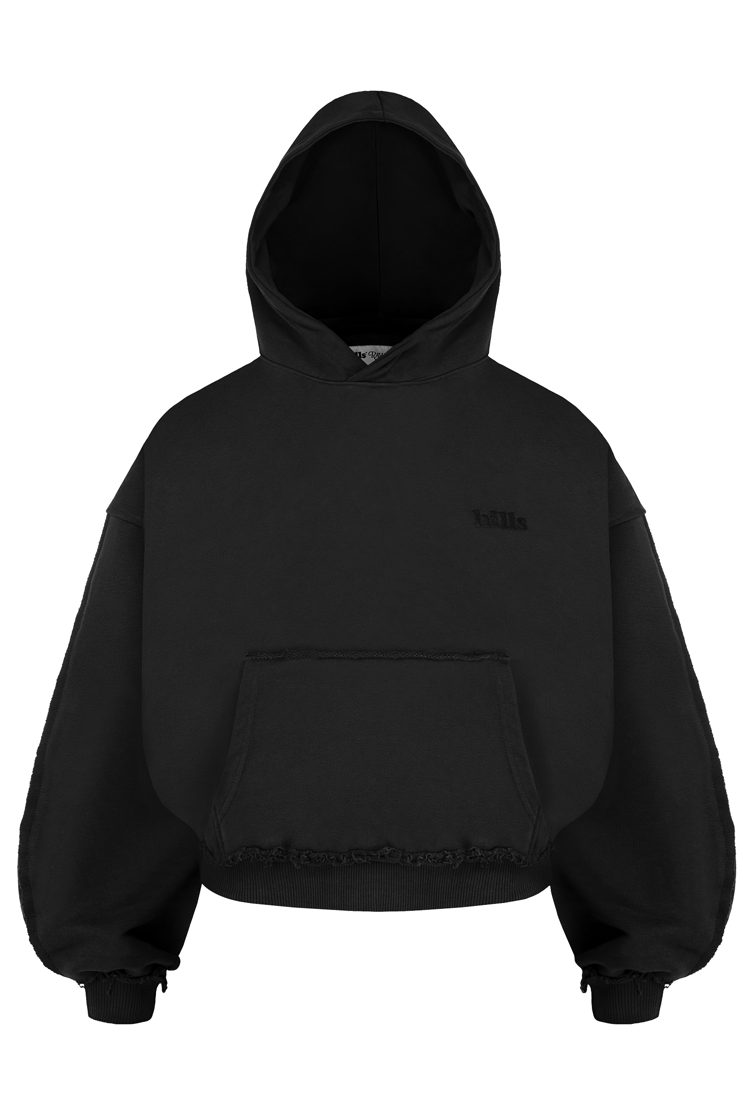 Black, cotton basic hoodie with boxy fit and hills® embroidery on the front.