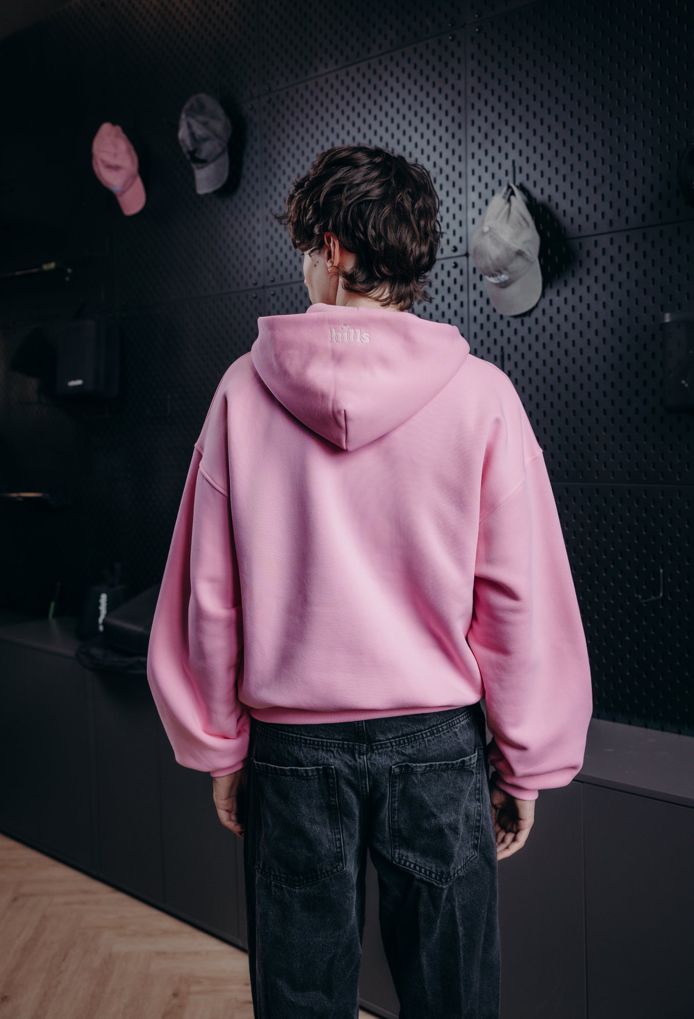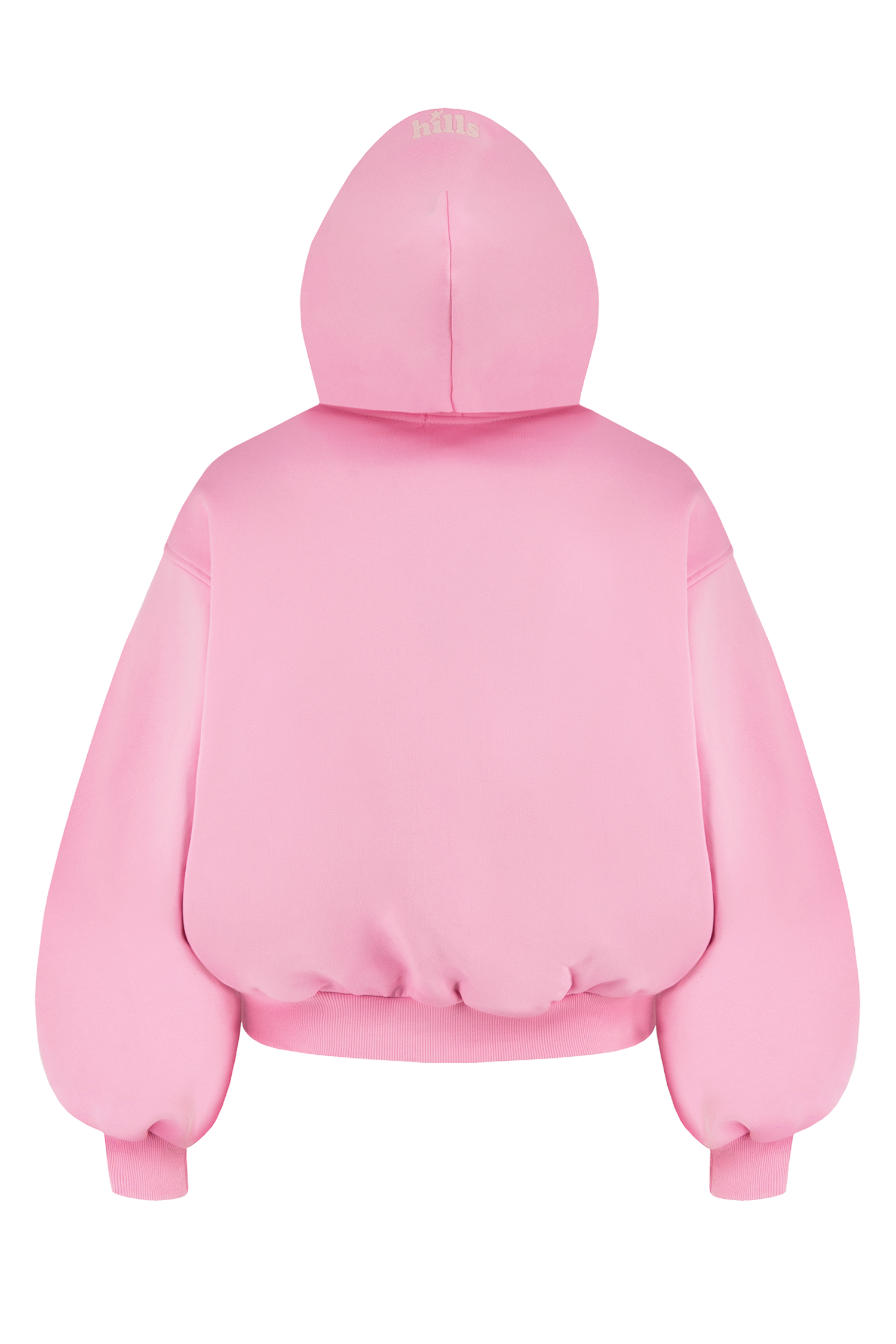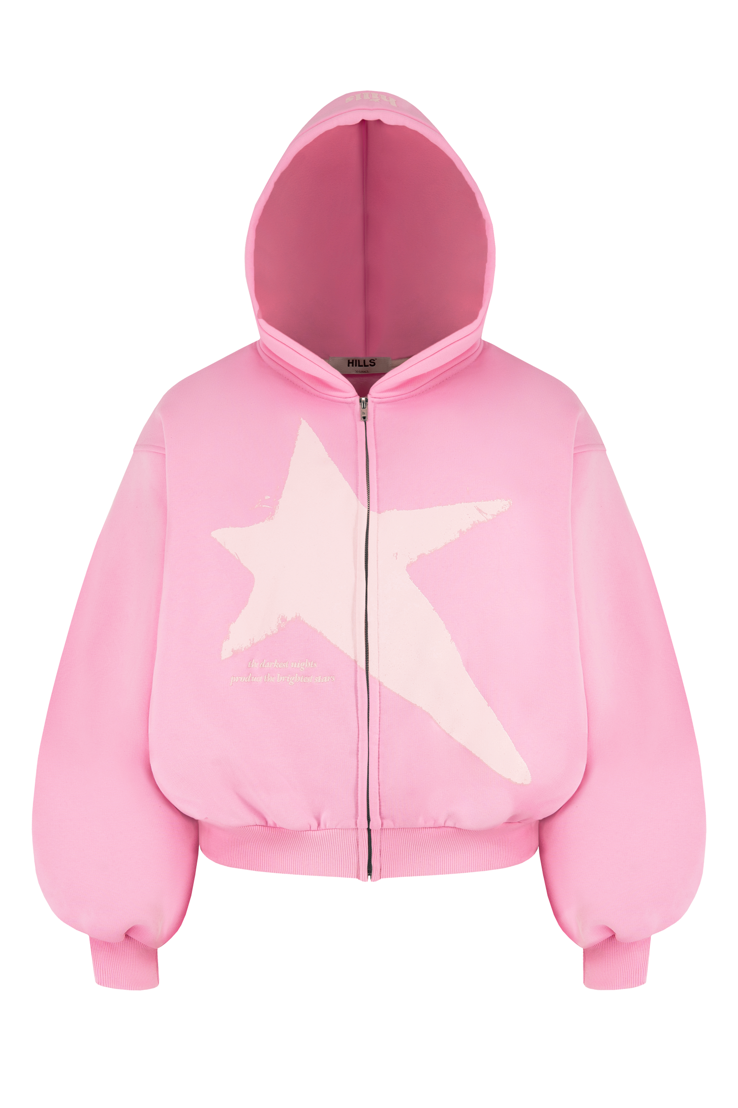 Pink, cotton boxy zip hoodie with printed star, "the darkest nights produce the brightest stars" embroidery and hills logo embroidered on the hood.