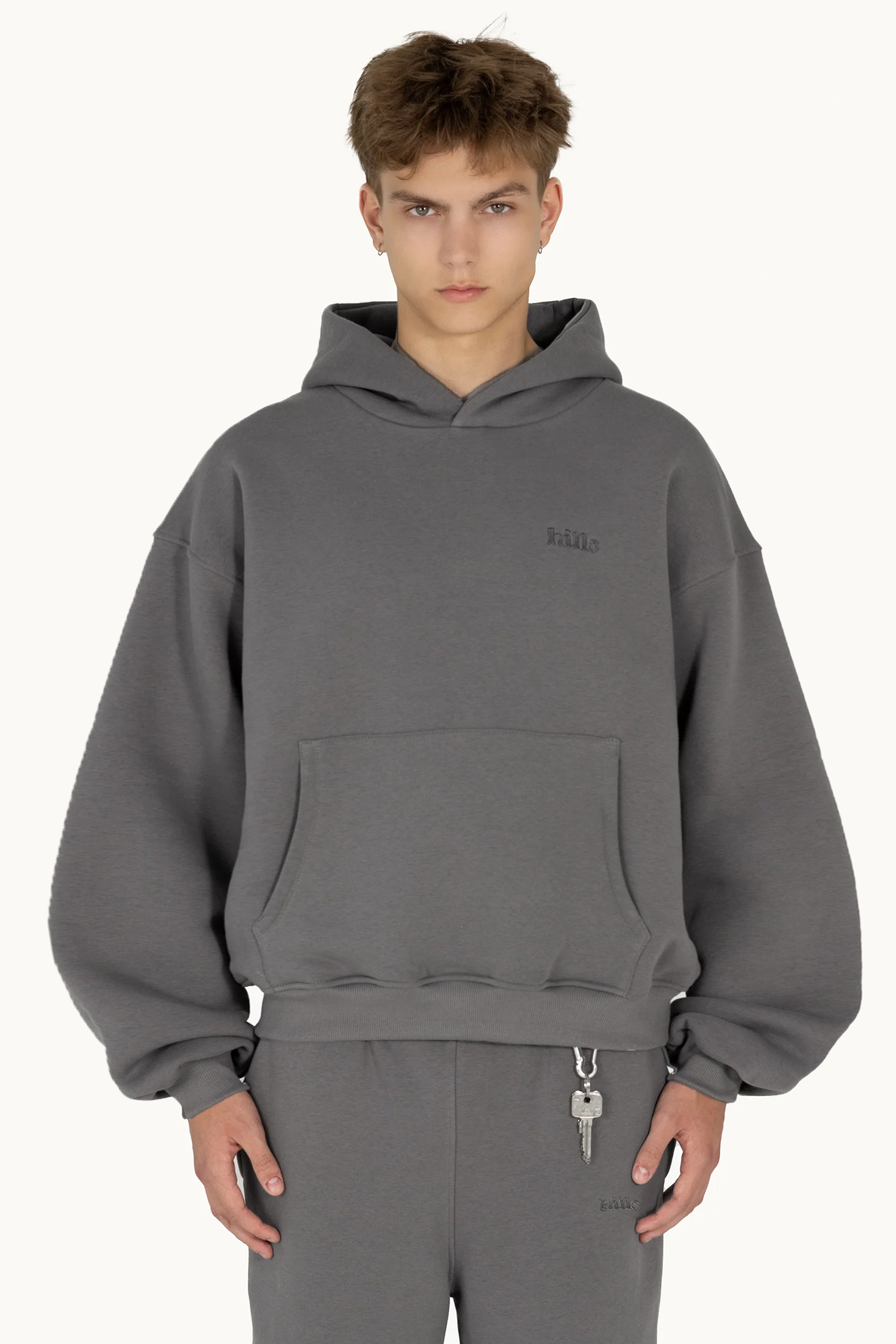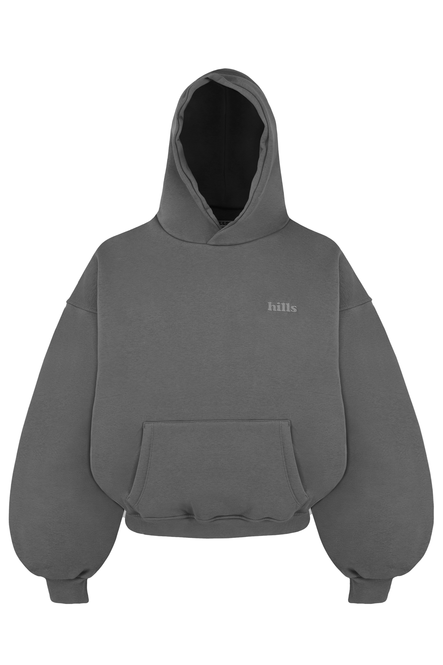 Grafitowa, bawełniana bluza basic o kroju boxy z haftem hills® na froncie.