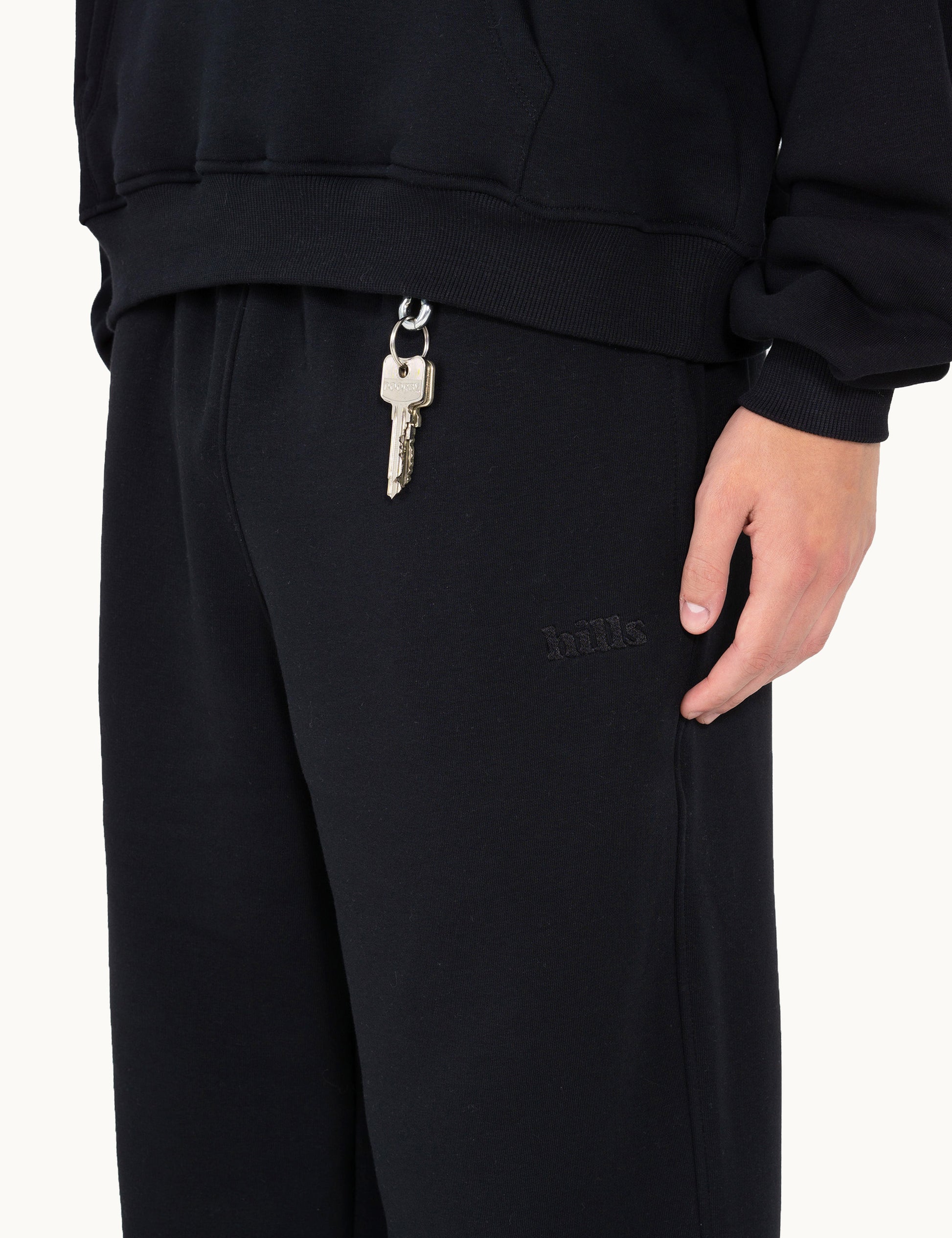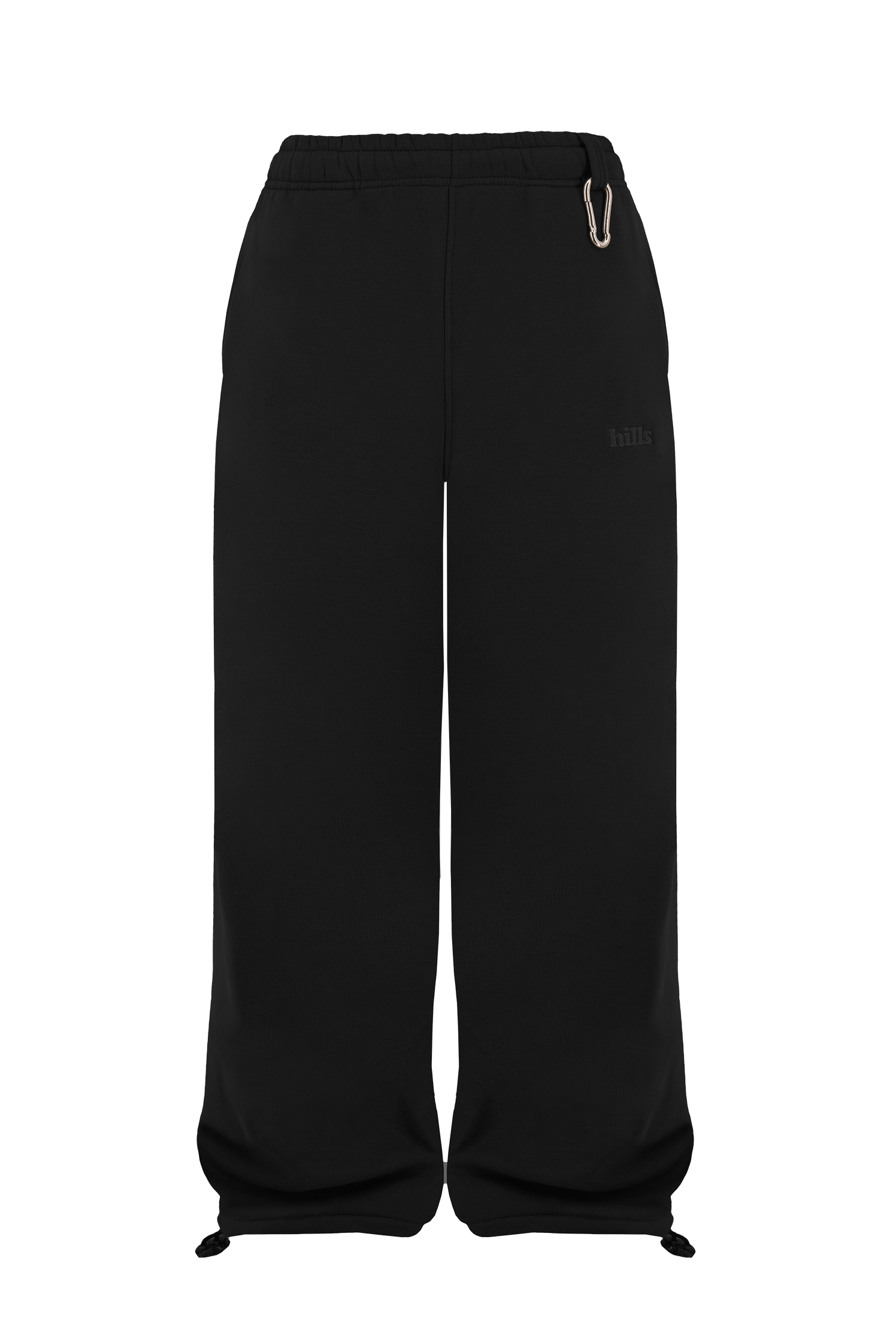 Czarne, bawełniane spodnie dresowe basic o kroju baggy z haftem hills® na froncie.