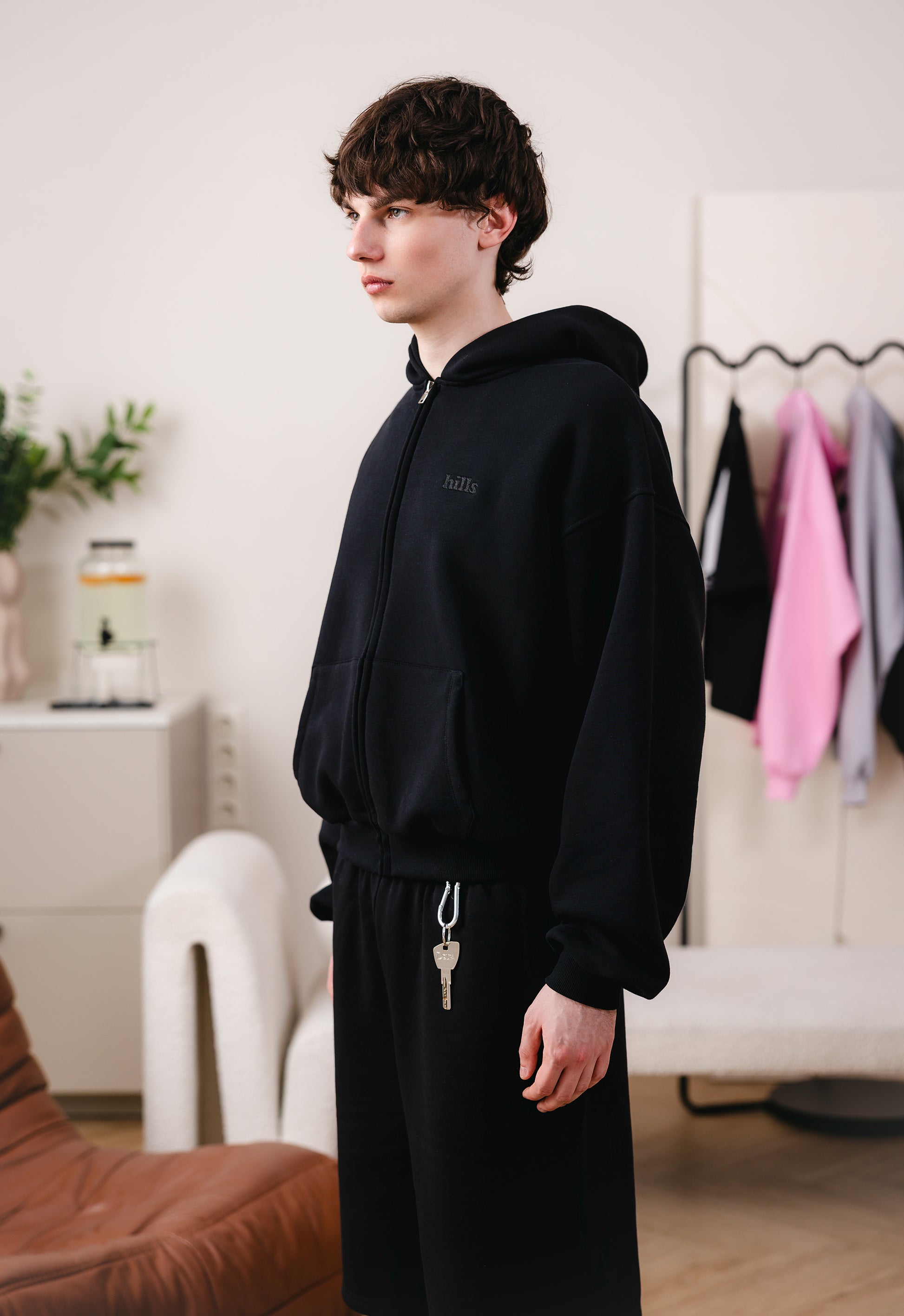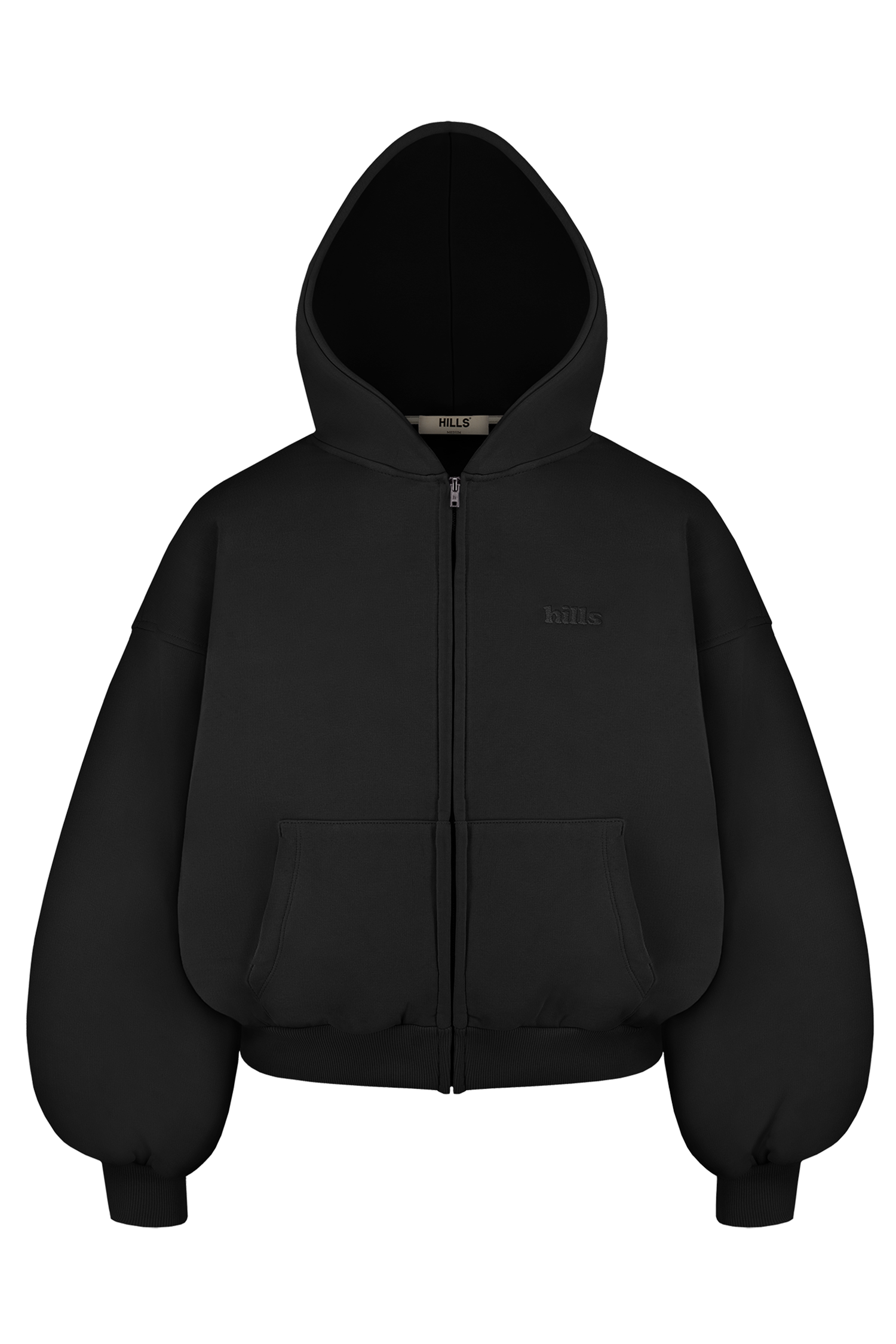 Czarna, bawełniana bluza rozpinana basic o kroju boxy z haftem hills® na froncie.