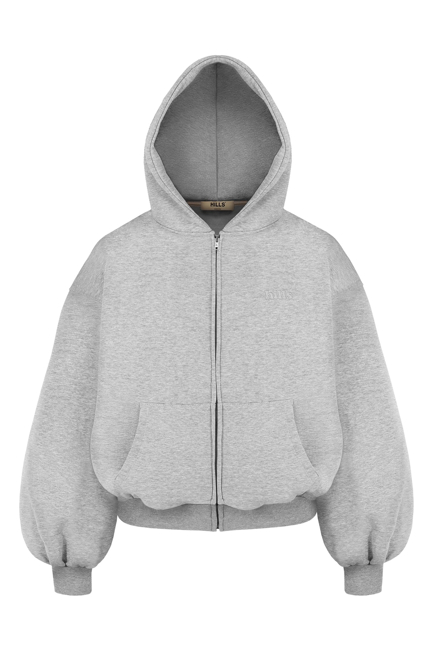 Szara, bawełniana bluza rozpinana basic o kroju boxy z haftem hills® na froncie.