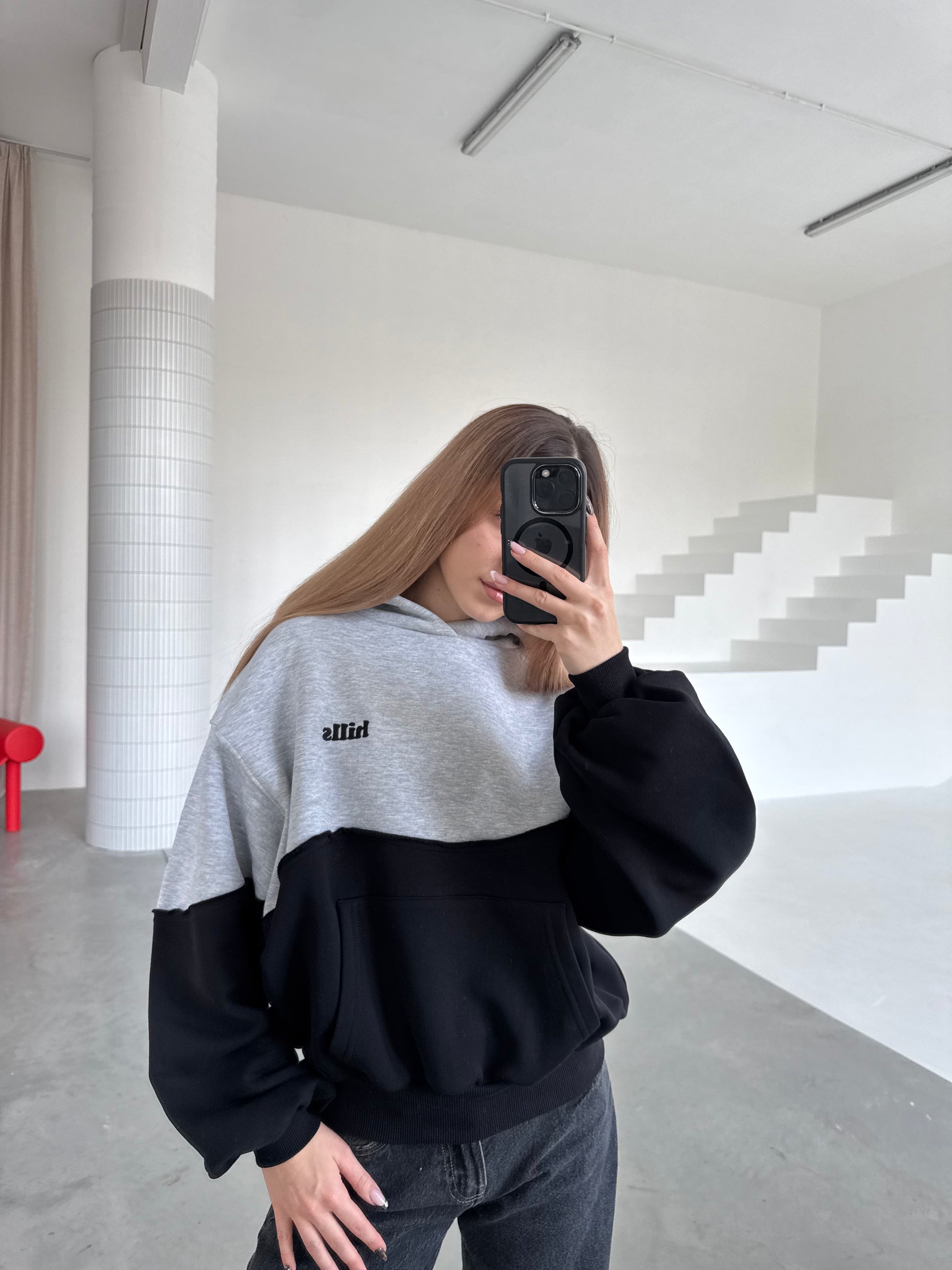 Cotton boxy hoodie with a bold contrasting seam running across front, back and sleeves.