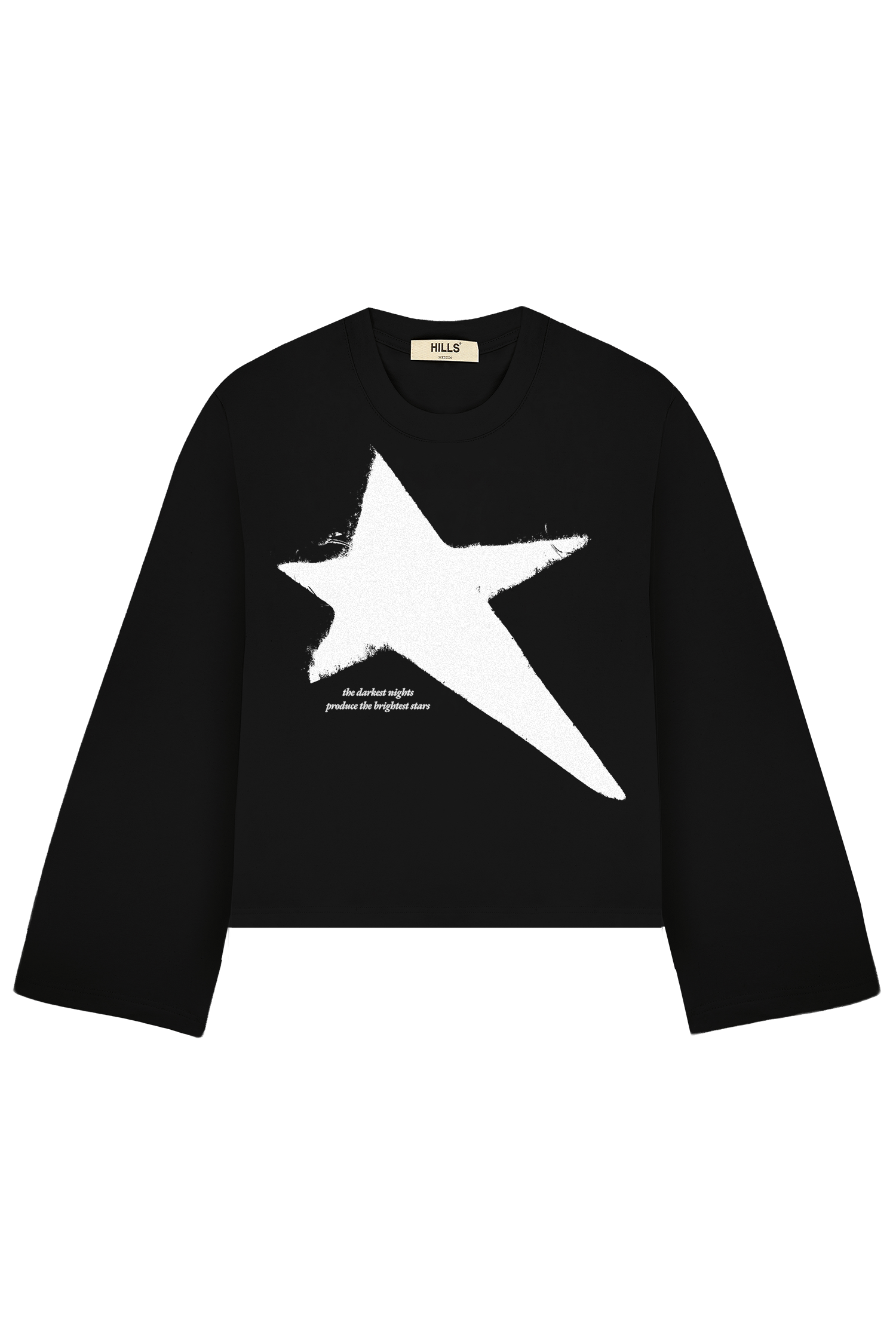 Czarny, bawełniany boxy longsleeve z nadrukowaną gwiazdą, haftem "the darkest nights produce the brightest stars" z przodu oraz haftem hills® na karku.
