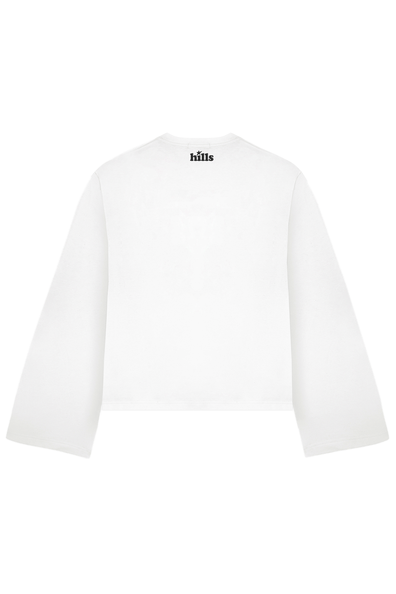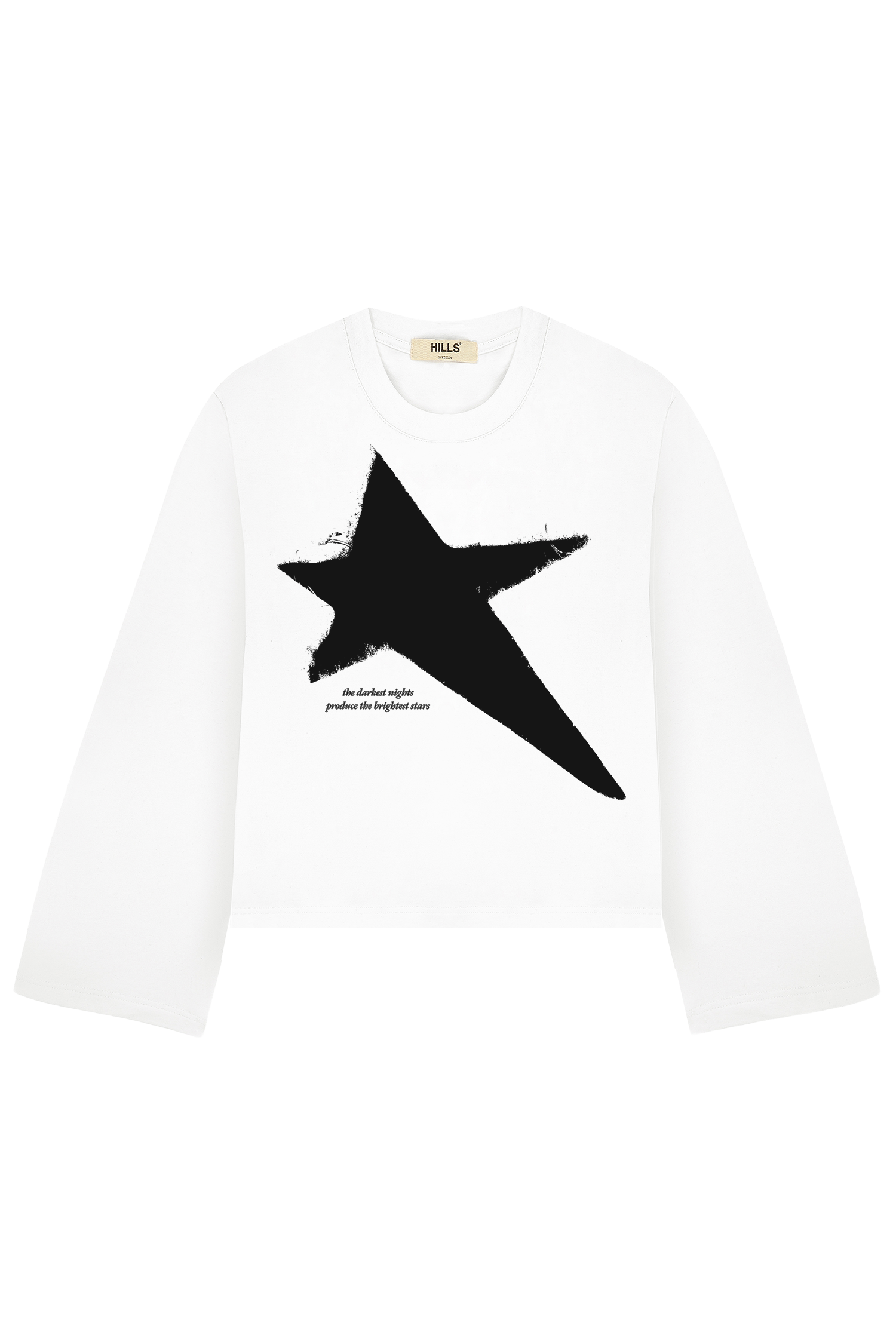 Biały, bawełniany boxy longsleeve z nadrukowaną gwiazdą, haftem "the darkest nights produce the brightest stars" z przodu oraz haftem hills® na karku.