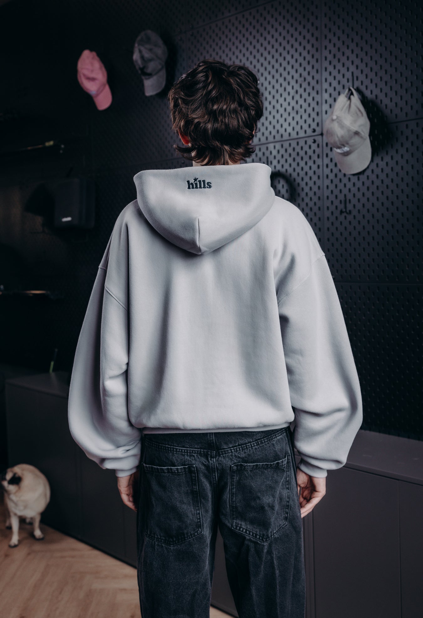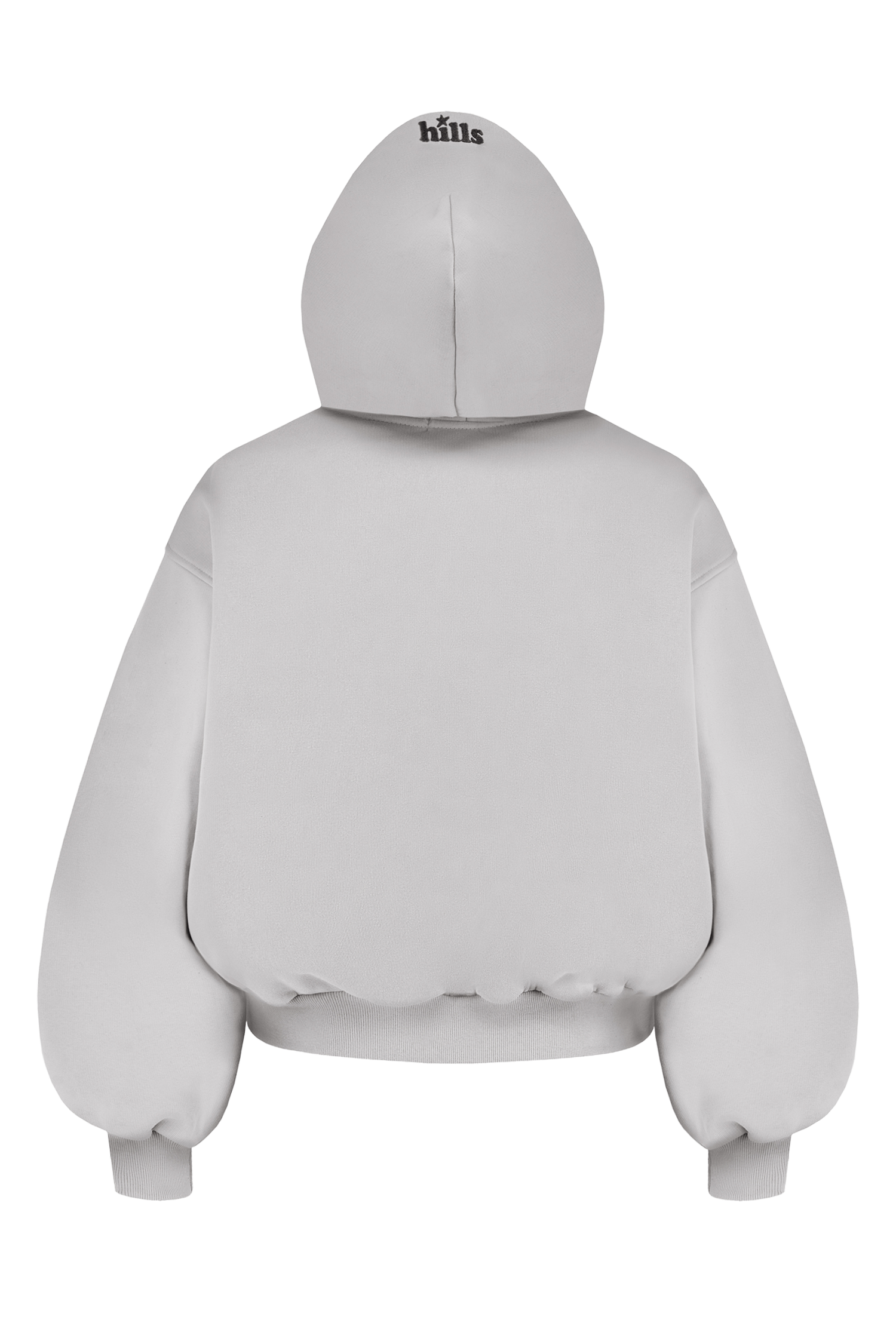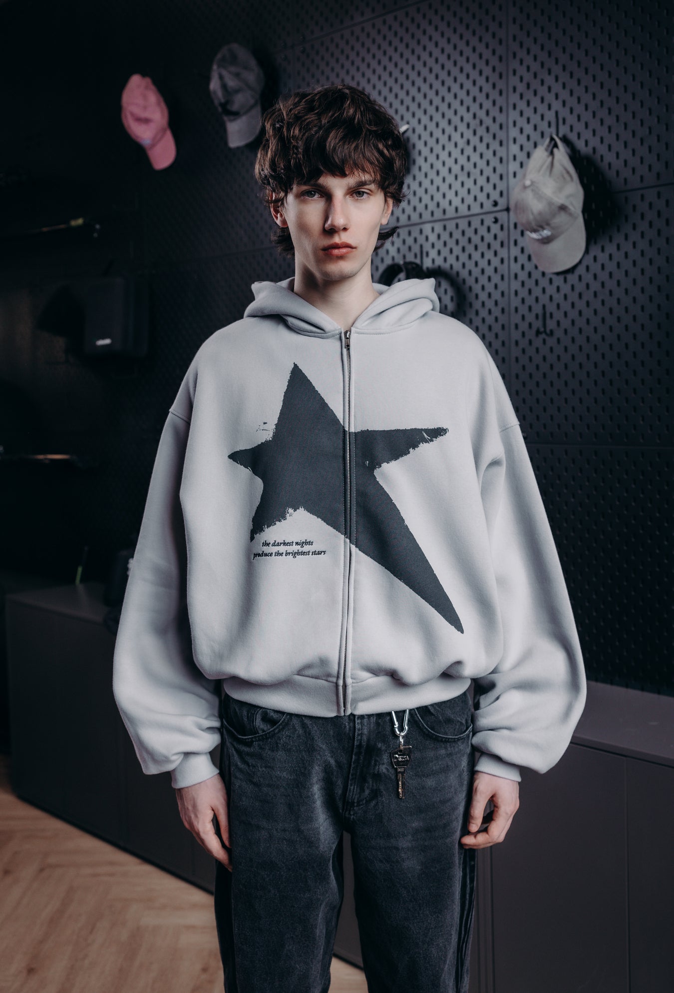Szara, bawełniana bluza rozpinana o kroju boxy z nadrukowaną gwiazdą, haftem "the darkest nights produce the brightest stars" z przodu oraz haftem hills® na kapturze.